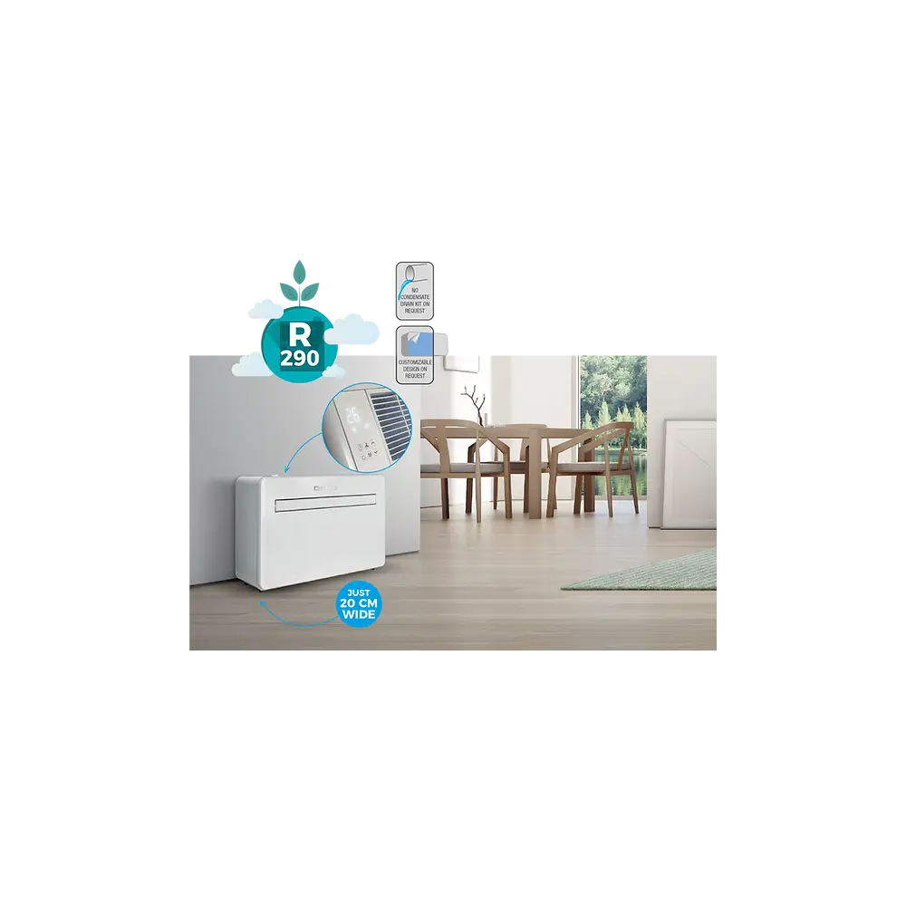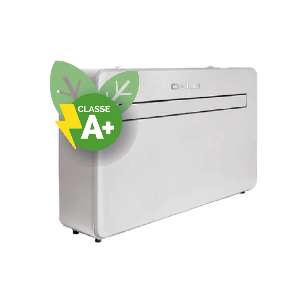 Dankzij het compacte ontwerp met een dikte van 35,5 cm is de Oslo 4.2 monoblock airco ideaal overal te installeren. De volledige techniek zit in de compacte behuizing van alleen de binnenunit, er is geen buitenunit voor nodig zoals bij een split airconditioning. Er zijn slechts twee gaten door een buiten muur naar buiten nodig. Een voor de circulatie van de warme lucht (inverter-warmtepomp) en het andere gat voor het afvoer van het condenswater.