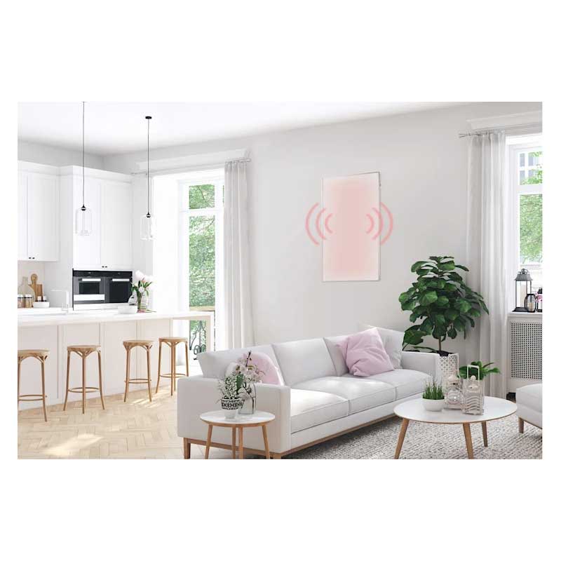 Verwarmen d.m.v. infraroodverwarming is vele malen gezonder dan via de traditionele cv-radiatoren met convectie verwarming. Infrarood panelen geven straling warmte die opgenomen wordt door wanden, vloeren en alle objecten in de ruimte. Dit in tegenstelling van Cv radiatoren die de lucht verwarmen, daarom is het boven tegen plafond warm en op de vloer koud. Dit houdt in dat een Infrarood verwarming paneel van 900w een gemiddelde ruimte van 18 m² makkelijk kan verwarmen. De massa geeft de warmte weer terug aan de ruimte waardoor er overal een gelijkmatige warmte is. Door de stralingwarmte die afgegeven wordt door het infrarood paneel zijn er geen minuscule stofdeeltjes in de lucht.